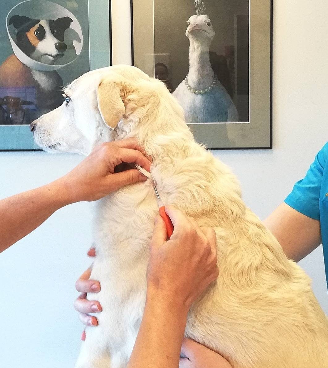 Der Applikator sieht aus wie eine Spritze mit dicker Kanüle. In der Kanüle steckt der Transporter. Die Haut wird an der Stelle der Implantation desinfiziert, um keine Keime einzubringen. Wir durchstechen dann die Haut und beim Niederdrücken des Kolbens bringen wir den kleinen Mikrochip ein. Mit dem Lesegerät kontrollieren wir anschließend den Sitz und die korrekte Funktion.